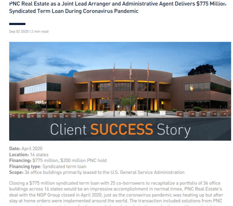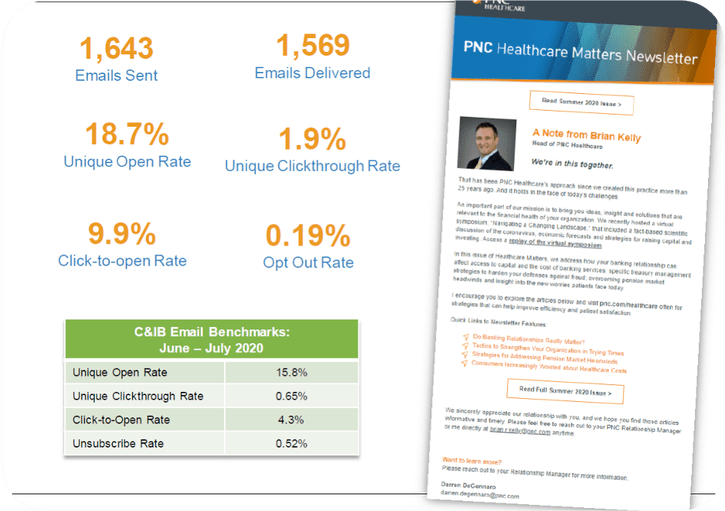“The importance of relationship banking” article was not only the top performer in the summer Healthcare Matters newsletter, but also the top performer on our C&IB LinkedIn showcase page . Worked with the Head of PNC Healthcare to develop an in-depth bylined article on the impact of the pandemic on banking relationships. (Link)